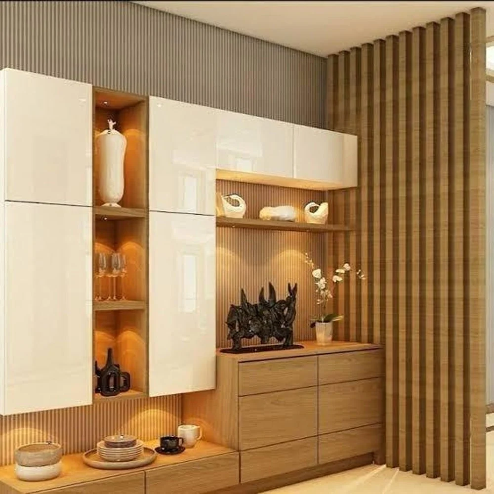 The crockery unit typically features a combination of open shelves, closed cabinets, and drawers.